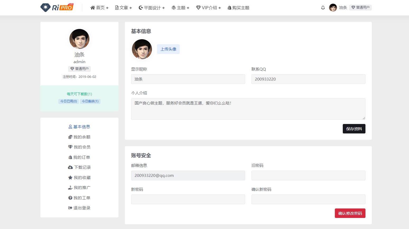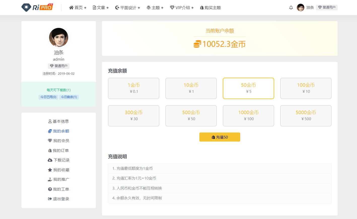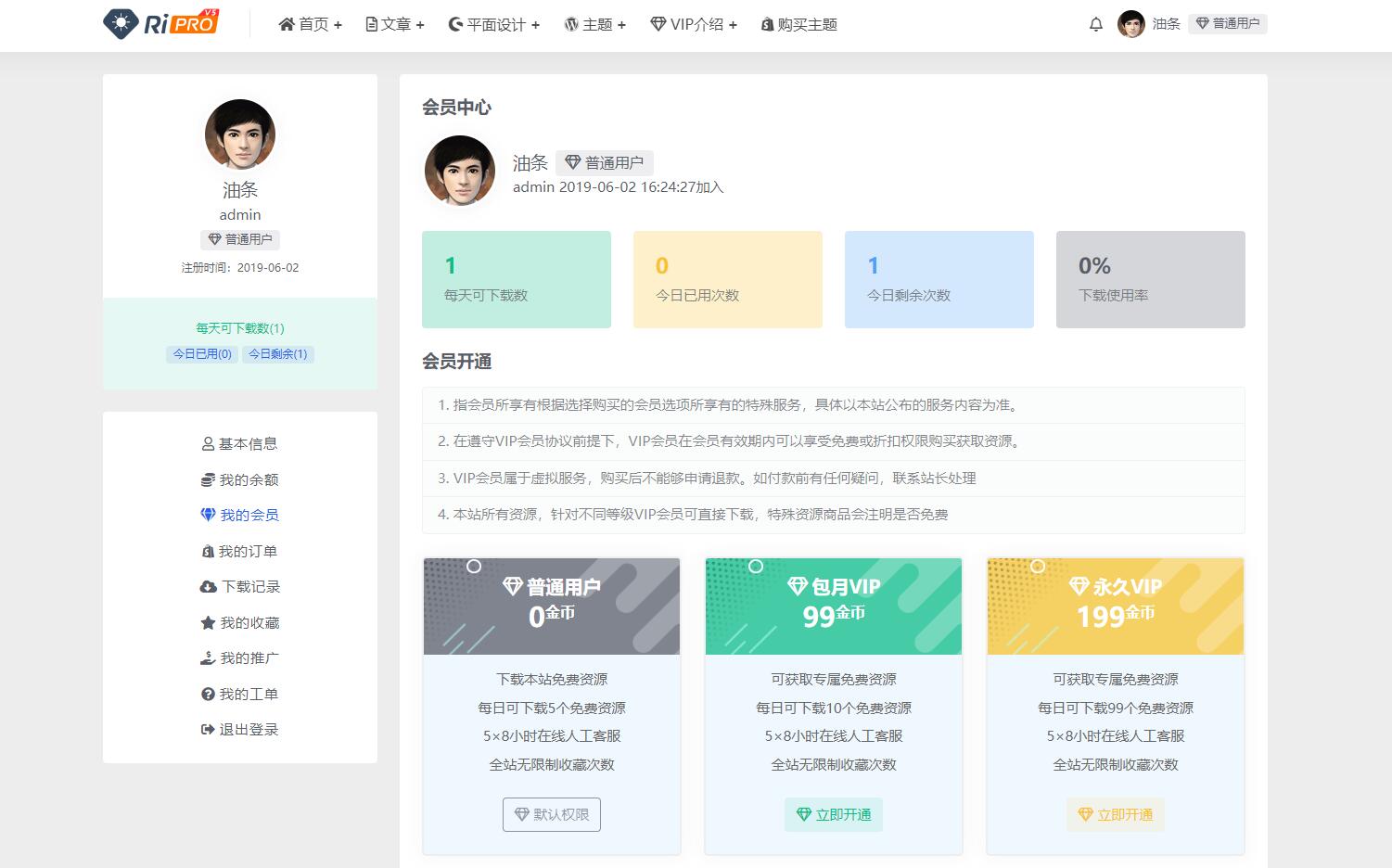 - 推荐理由,功能相对较多更为复杂,目前用户用的最多的一款主题,稳定奔放,支持站内币购买充值余额购买消费,支持自定义站内币比例,名称图标等,支持用户购买某个单品时按照他的会员组权限设置折扣,ripro只有会员或非会员模式,会员可以免费获取资源或者通过折扣购买资源,非会员则原价购买,特别注意,ripro的会员组只有会员,或非会员,管理员可以定义会员名称和普通用户名称。